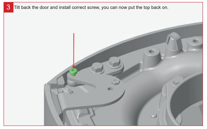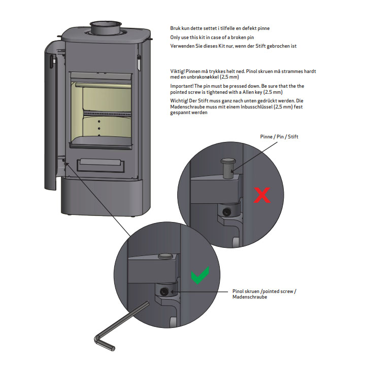 During transport or disassembly of the door, it has been discovered that the pin bolt can move out of position on Jøtul F 230. This can lead to the hinge pin losening from the burn chamber, slide out of its correct position and cause injuries. It can be solved by checking the pin bolt on the lower hinge seat. If there is a gap between the door hinge and the pin bolt, the pin must be pressed down. Then tighten the pointed screw, so that the pin bolt is locked in the correct position. The upgrade is considered to be simple and you can do it yourself without losing warranty.
